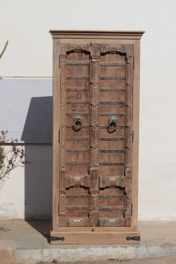 This beautifully handmade Indian almirah cupboard/ wardrobe has been handcrafted engraved wooden pieces, with metal adornments and a distressed finish.