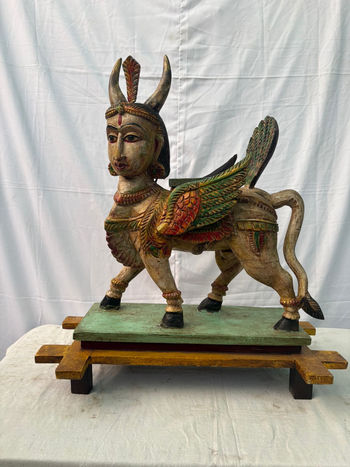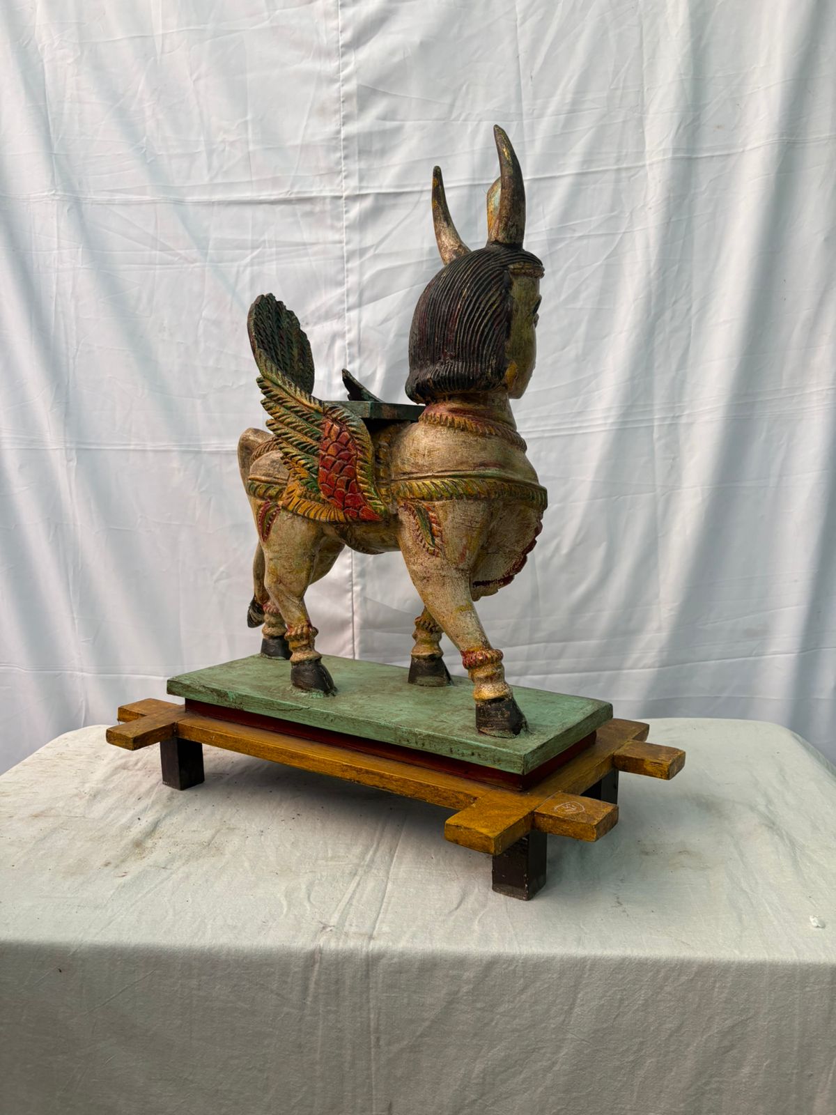 Crafted from well-aged wood and naturally weathered over time, the sculpture bears a rich patina and organic textures that reflect its authenticity and age. The serene expression, balanced form, and intricate detailing highlight the artisan’s devotion and mastery, making this vahanam both spiritually powerful and artistically refined.